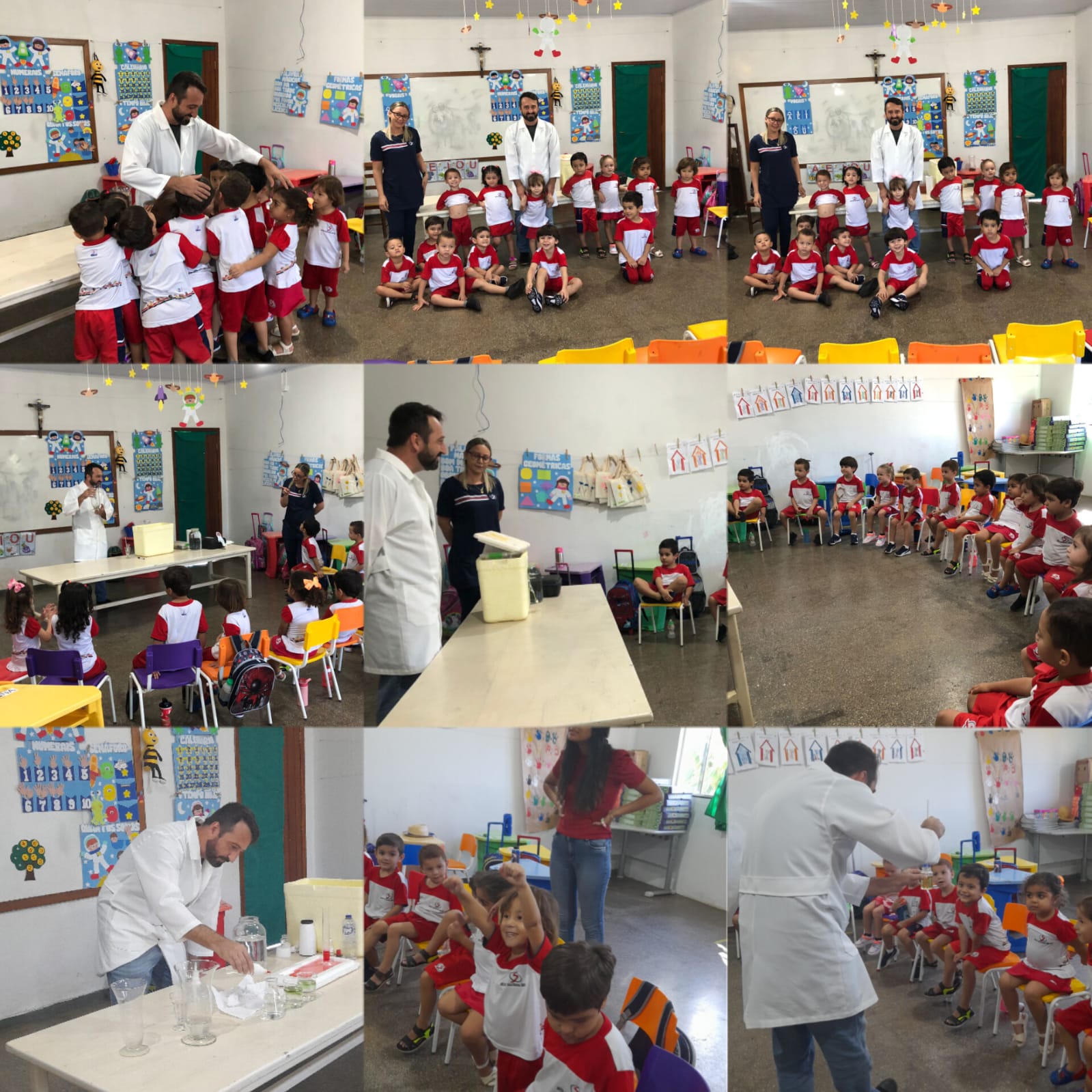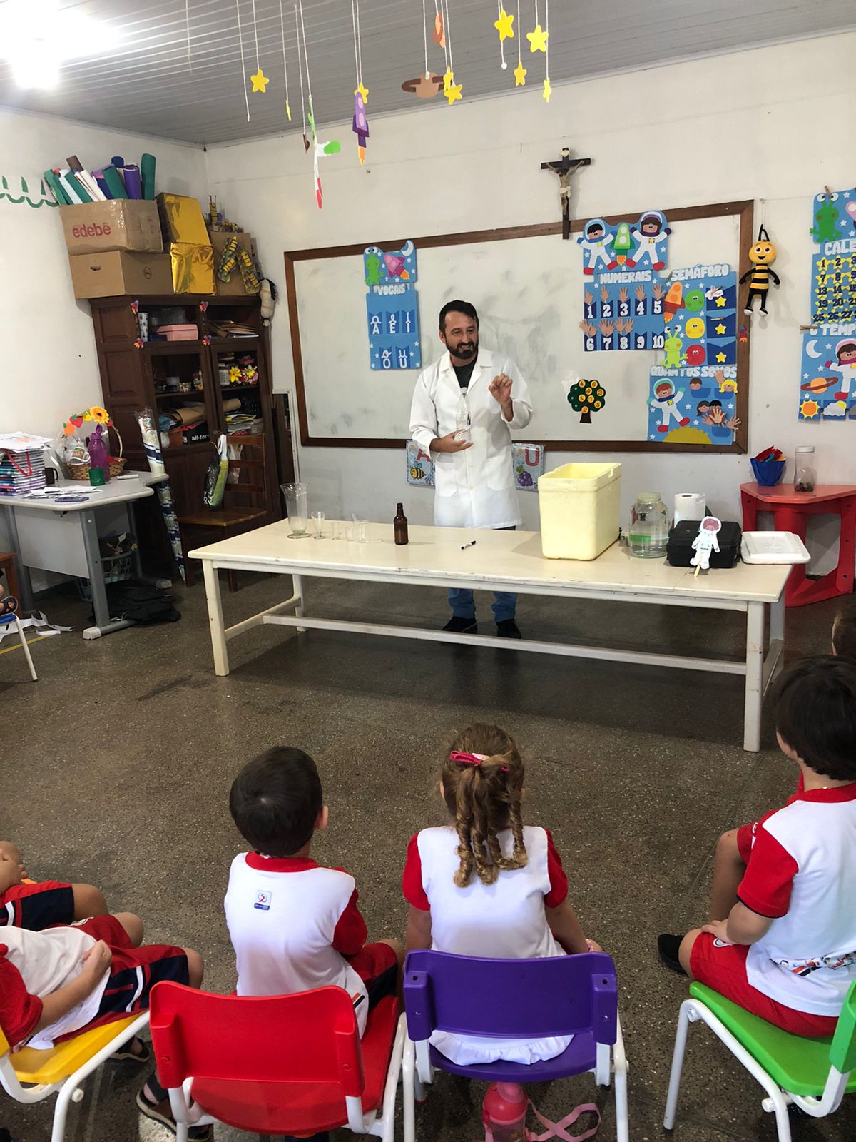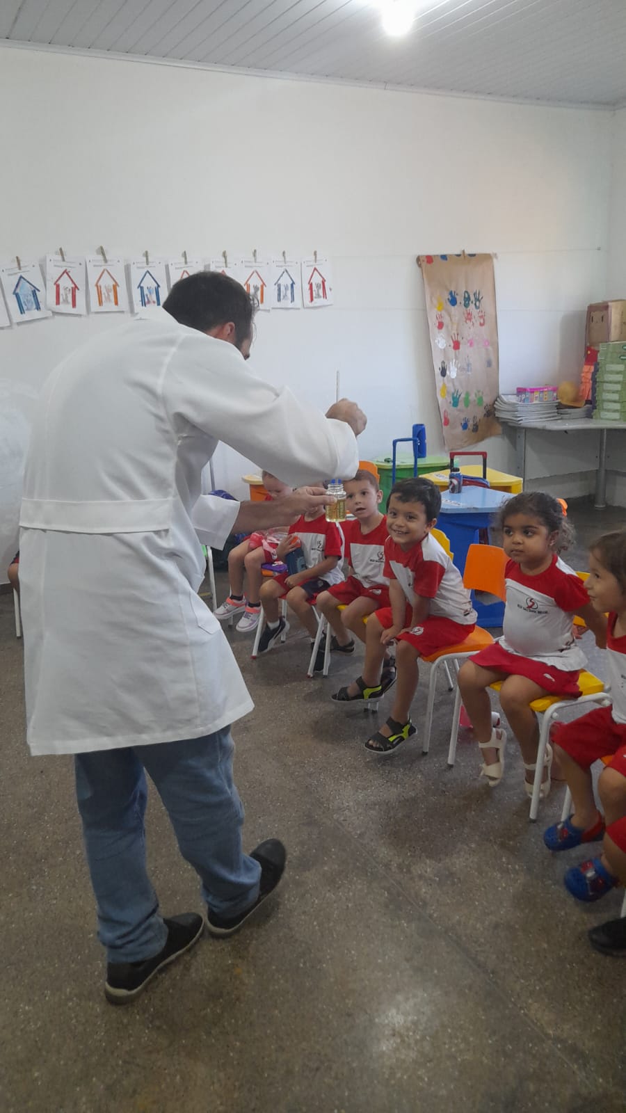 O projeto iniciou-se a partir do momento que a professora demonstrou a eles algumas experiências com cores que misturada com leite, detergente e corantes, as cores elas borbulhavam. Os alunos gostaram muito dessa experiências. A partir de uma roda de conversa, os alunos souberam os que cientistas fazem experiências, descobrem a cura de doenças, alguns até inventaram o avião como Santos Drumond. A aluna Laila disse que o pai dela é cientista ele fazia experiências, então as crianças queriam conhecer o pai da aluna Laila. Foi a partir dai que convidei o Professor de Química Alessandro para fazer algumas experiências com os alunos e explorar mais a imaginação deles. O professor Alessandro fez diversas experiências como: a água que vira neve, vulcão das cores, arco íris entre outras.