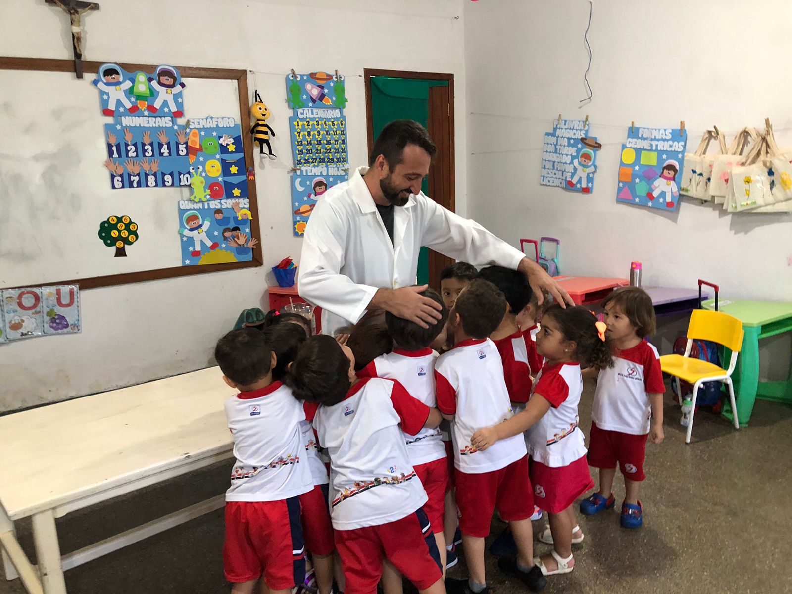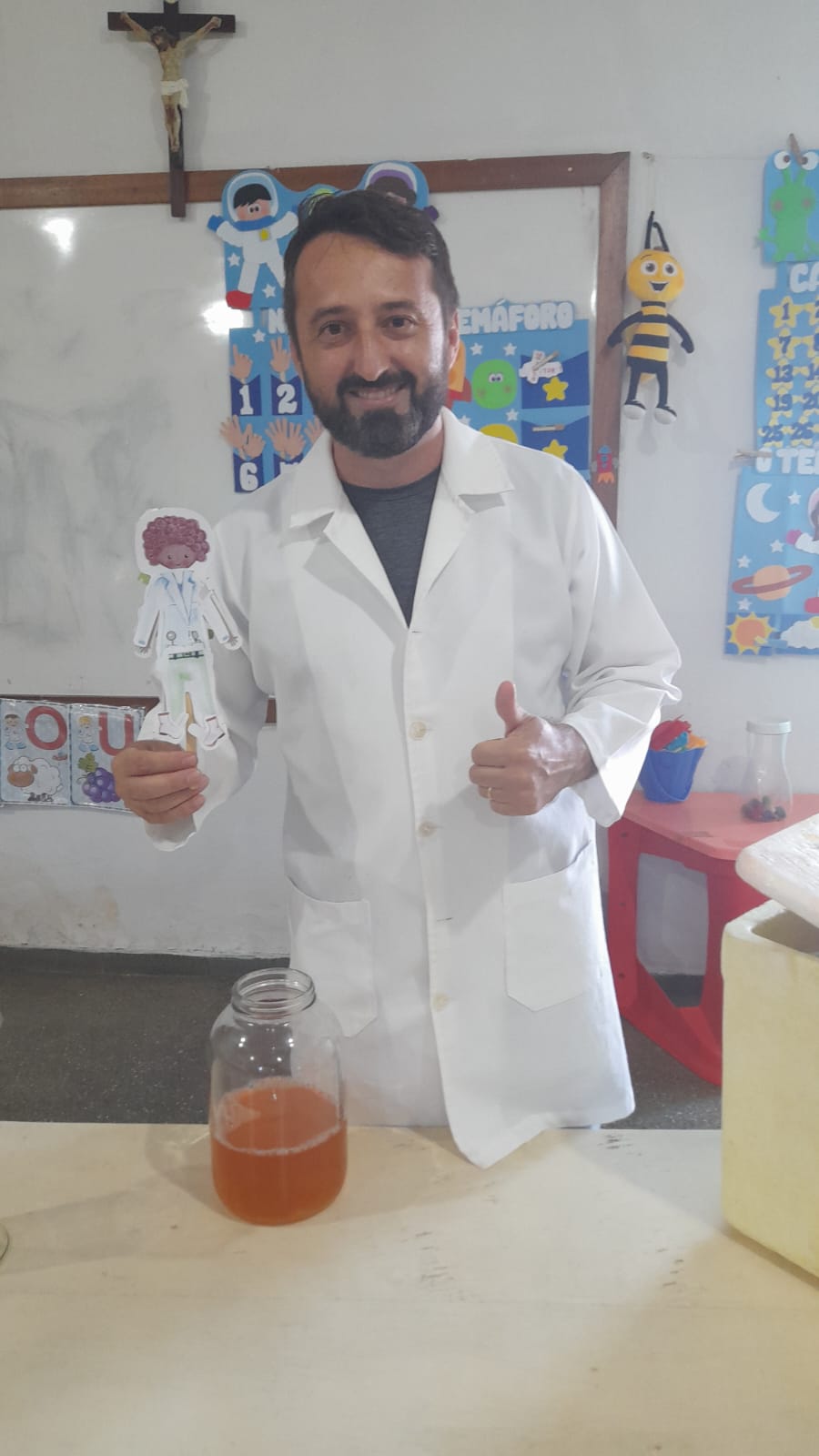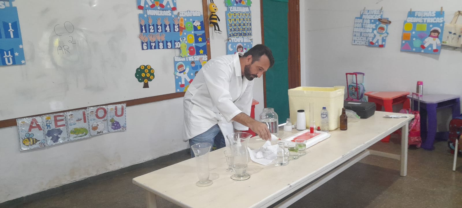 O projeto iniciou-se a partir do momento que a professora demonstrou a eles algumas experiências com cores que misturada com leite, detergente e corantes, as cores elas borbulhavam. Os alunos gostaram muito dessa experiências. A partir de uma roda de conversa, os alunos souberam os que cientistas fazem experiências, descobrem a cura de doenças, alguns até inventaram o avião como Santos Drumond. A aluna Laila disse que o pai dela é cientista ele fazia experiências, então as crianças queriam conhecer o pai da aluna Laila. Foi a partir dai que convidei o Professor de Química Alessandro para fazer algumas experiências com os alunos e explorar mais a imaginação deles. O professor Alessandro fez diversas experiências como: a água que vira neve, vulcão das cores, arco íris entre outras.