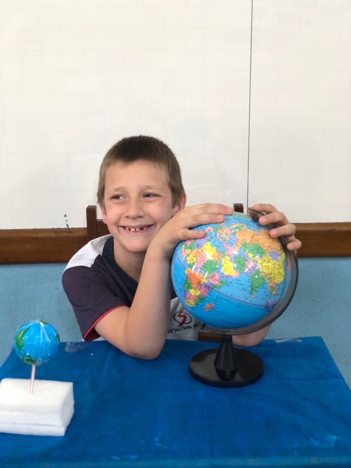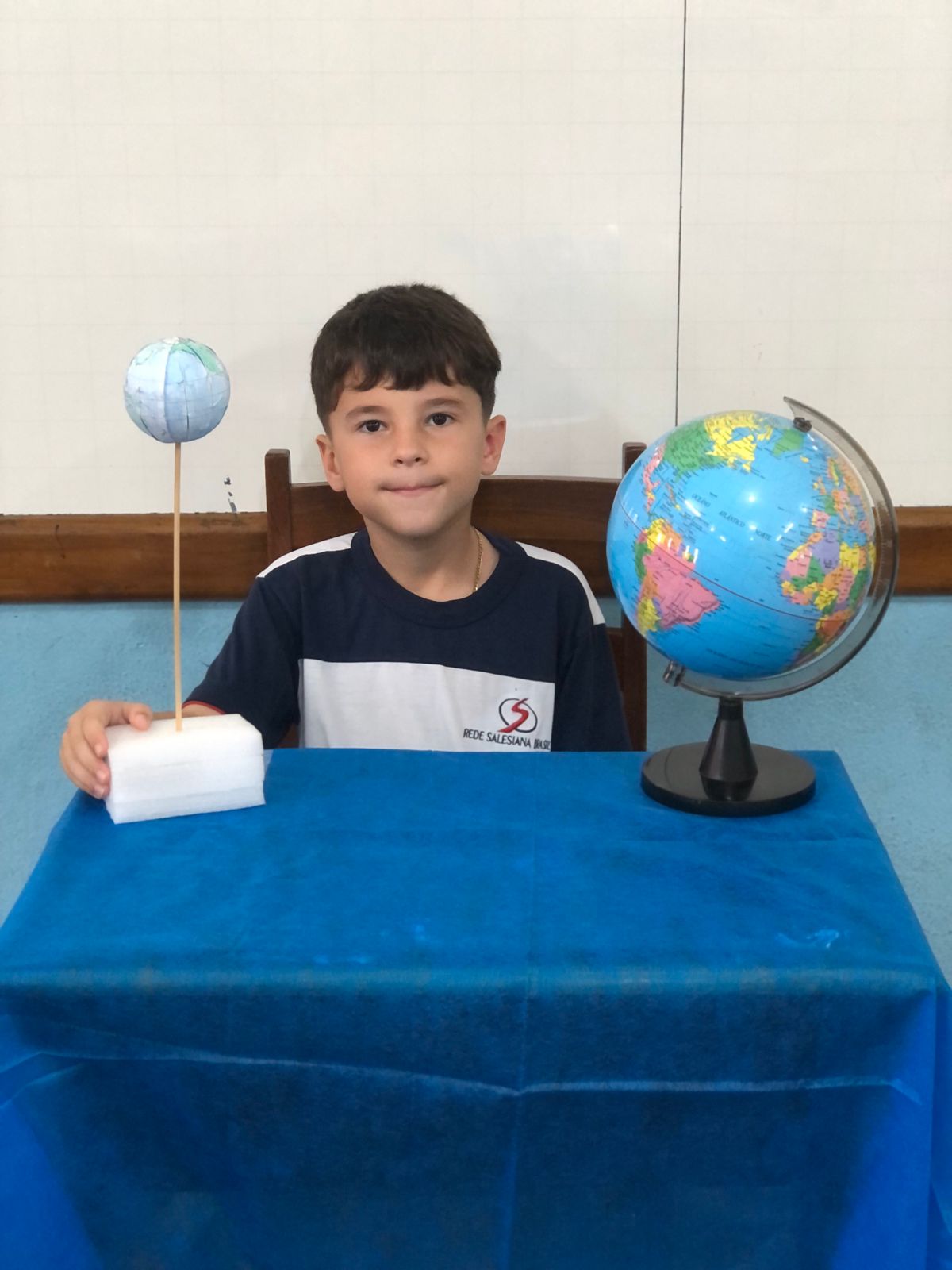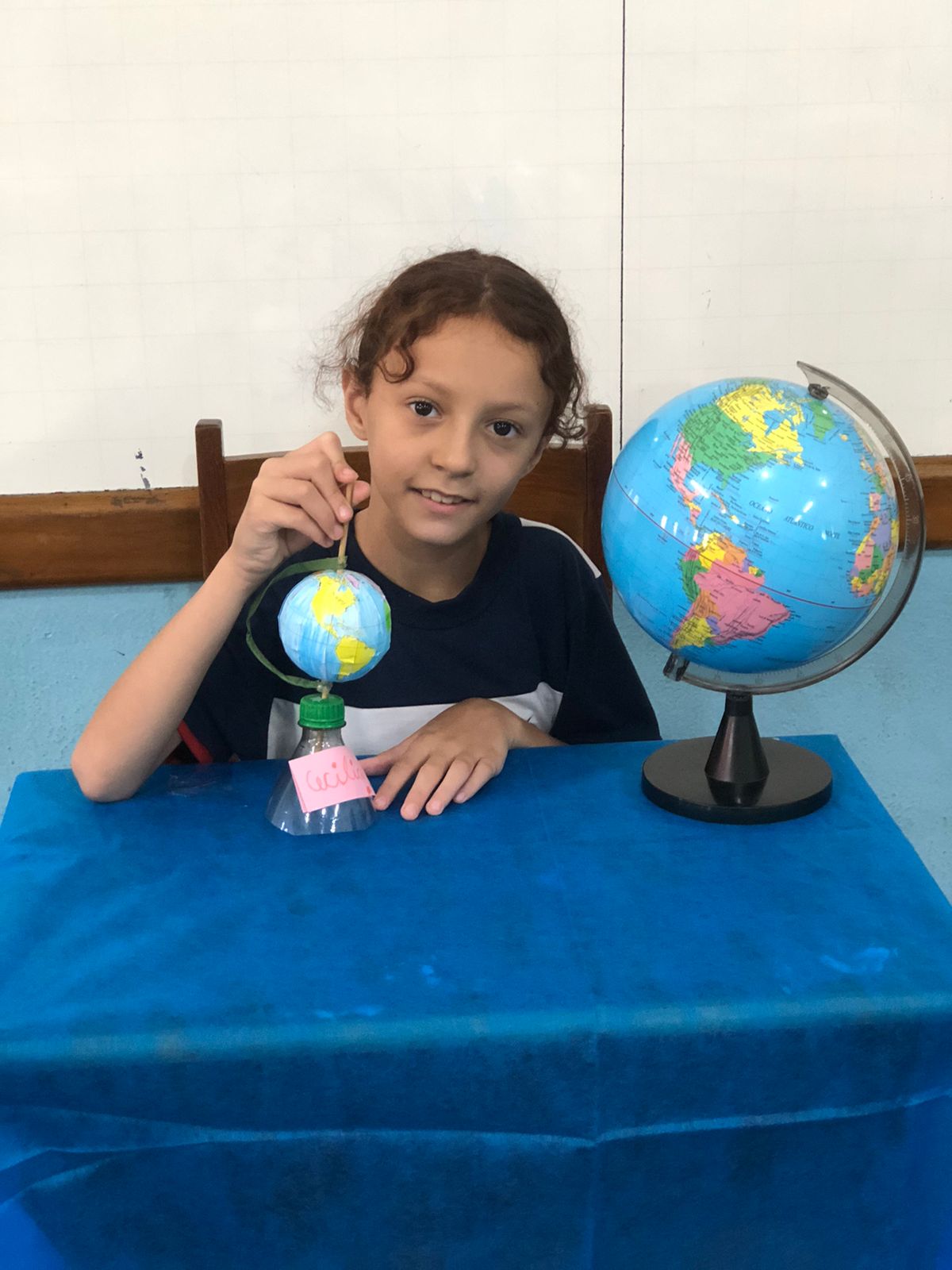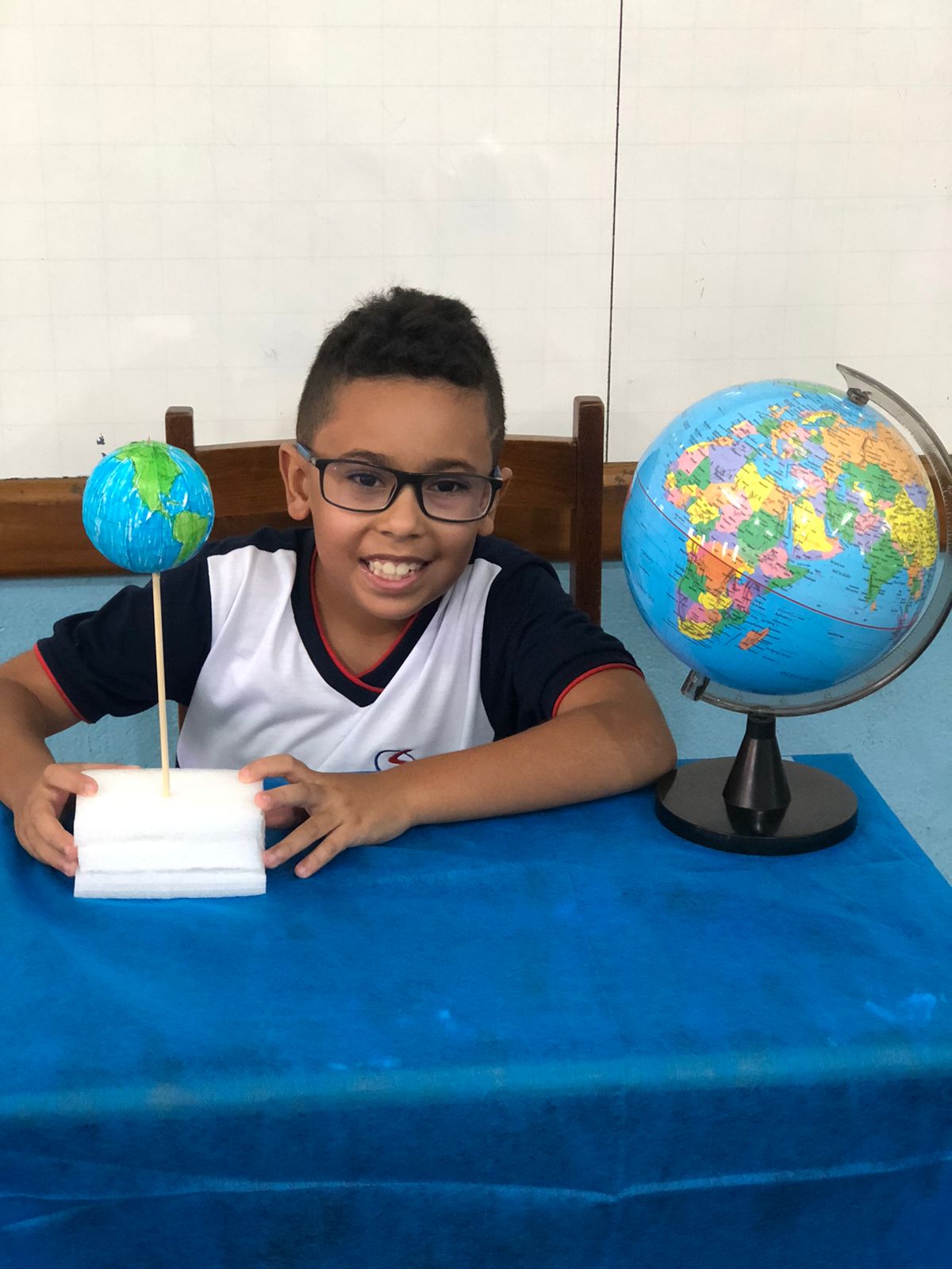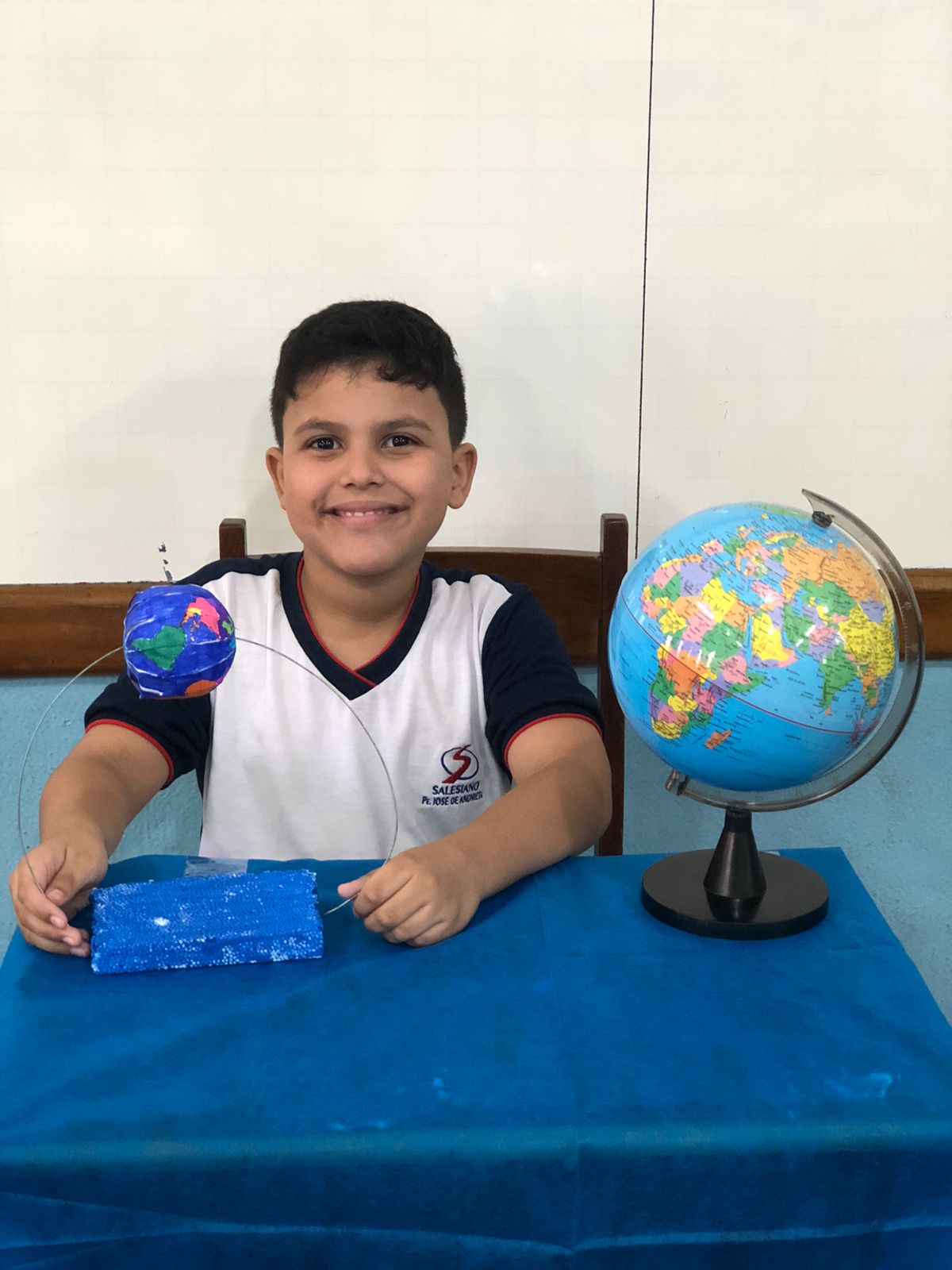 Os alunos do 3º ano confeccionaram um globo terrestre para realização da apresentação na aula de ciências. Assim, compreender como o nosso planeta tem o formato de uma esfera, como a bola de isopor, é preciso girar para visualizar os lugares e com base na observação, manipulação e comparação de diferentes formas de representação do planeta e como se assemelha à forma real.