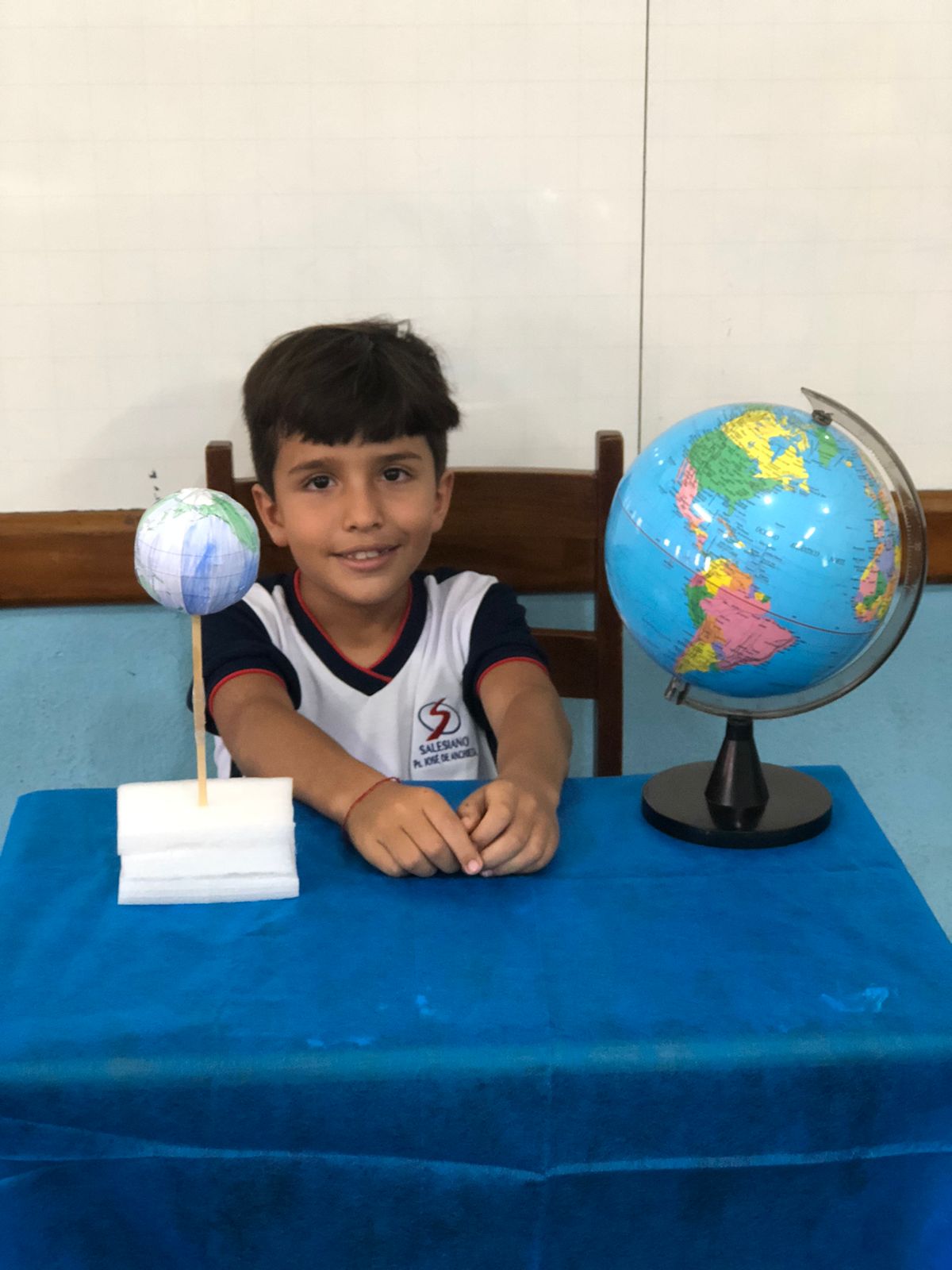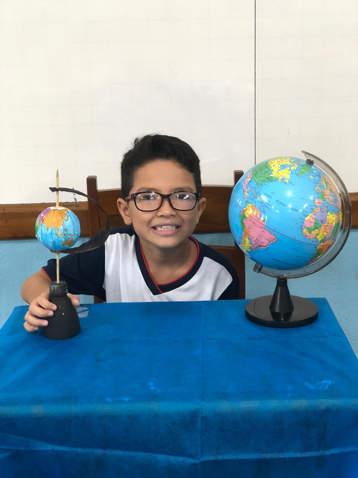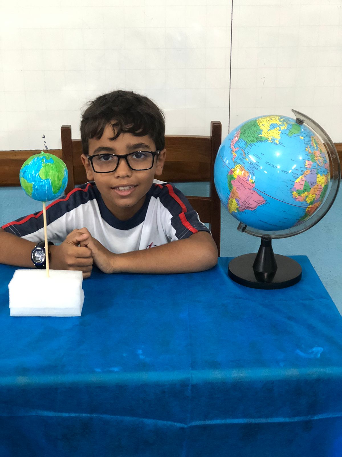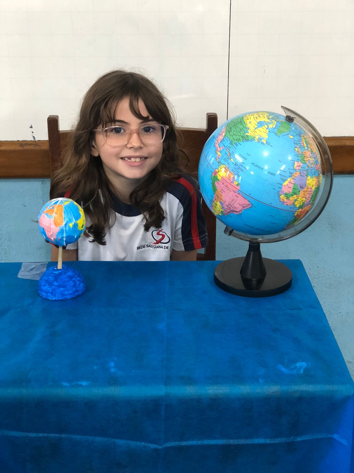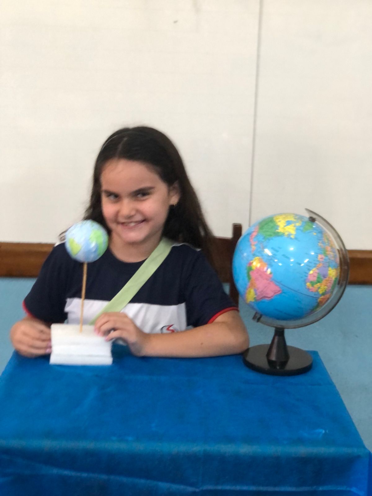 Os alunos do 3º ano confeccionaram um globo terrestre para realização da apresentação na aula de ciências. Assim, compreender como o nosso planeta tem o formato de uma esfera, como a bola de isopor, é preciso girar para visualizar os lugares e com base na observação, manipulação e comparação de diferentes formas de representação do planeta e como se assemelha à forma real.