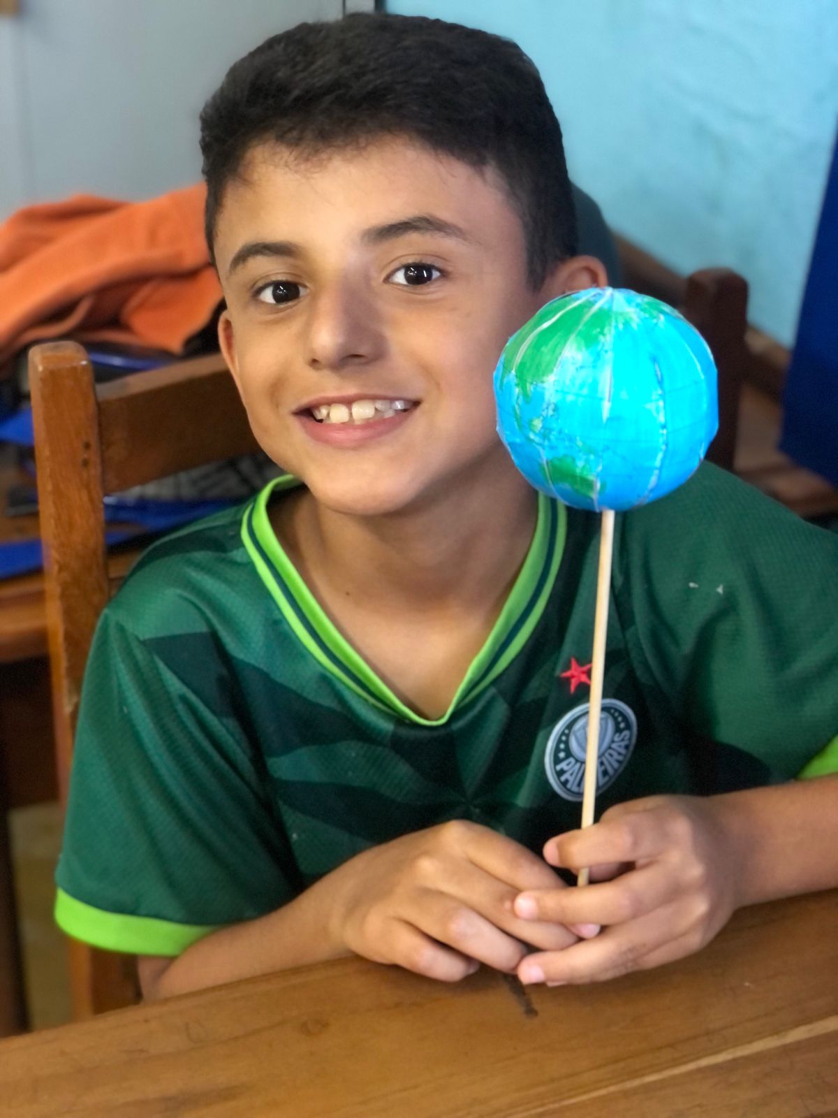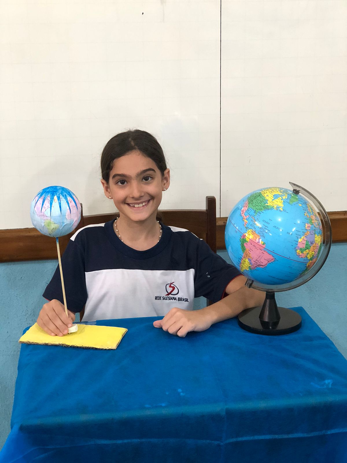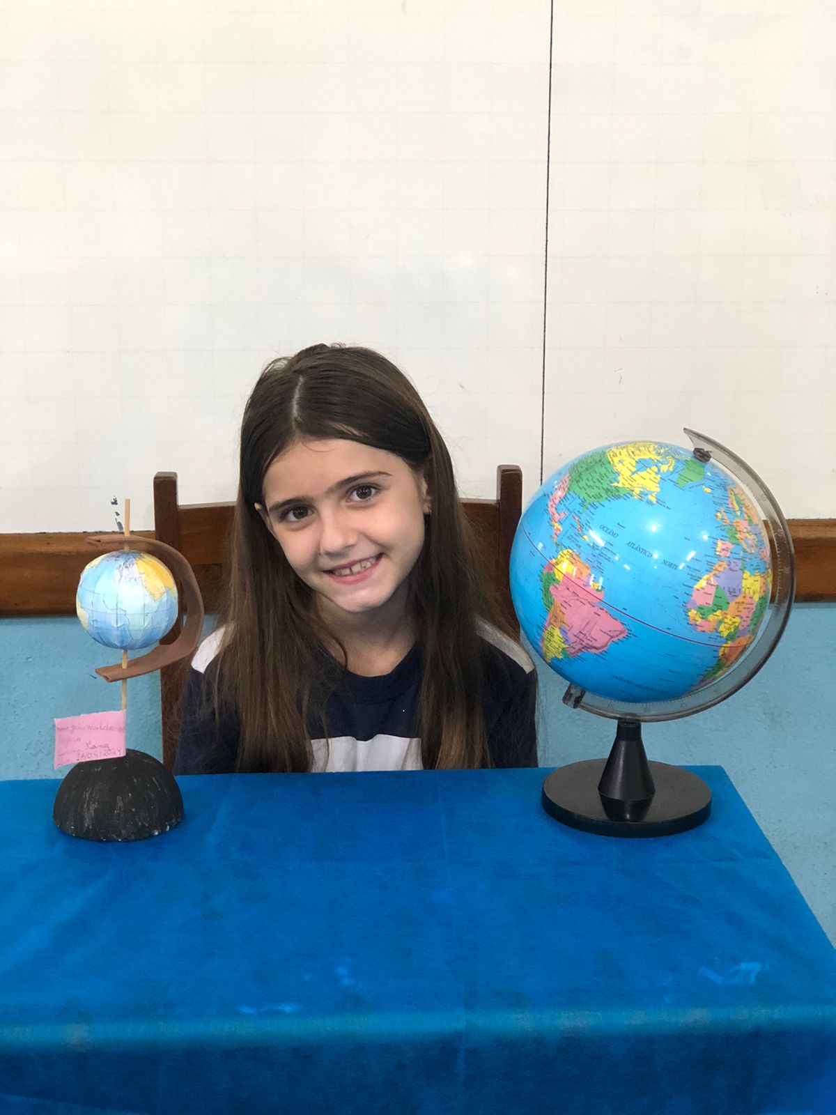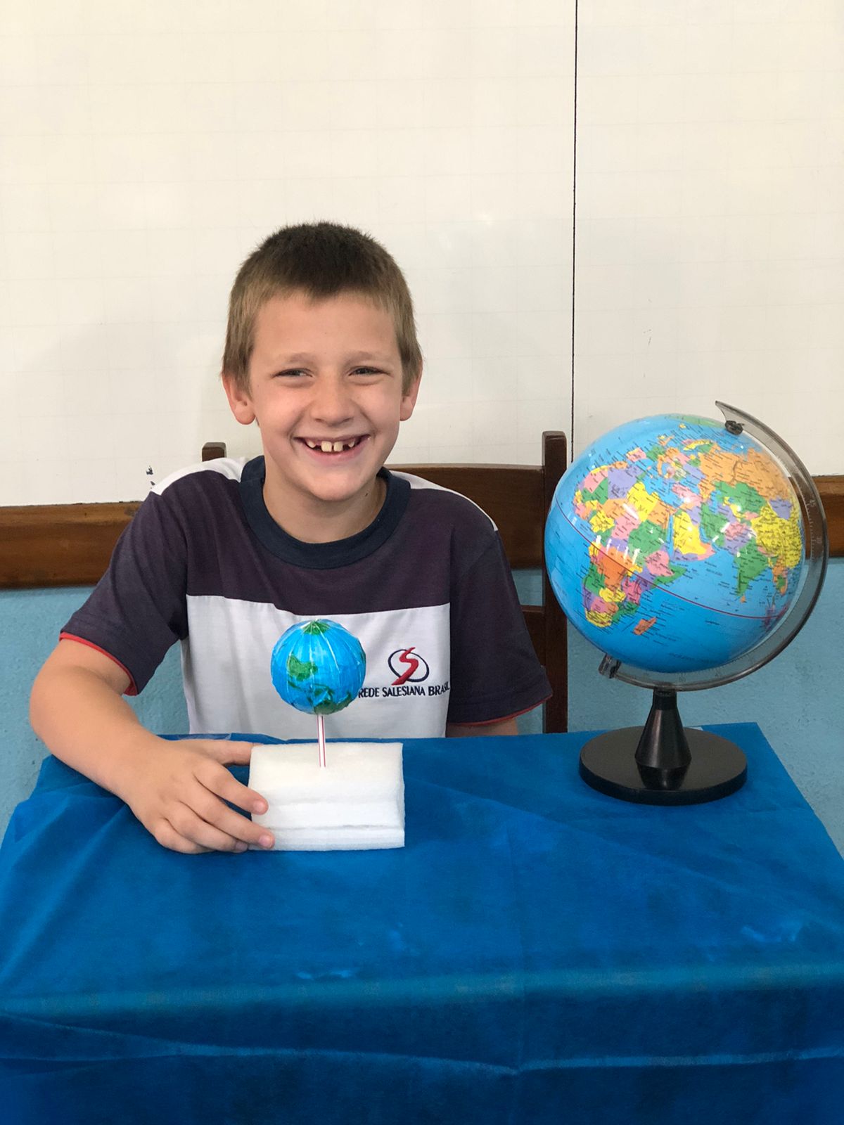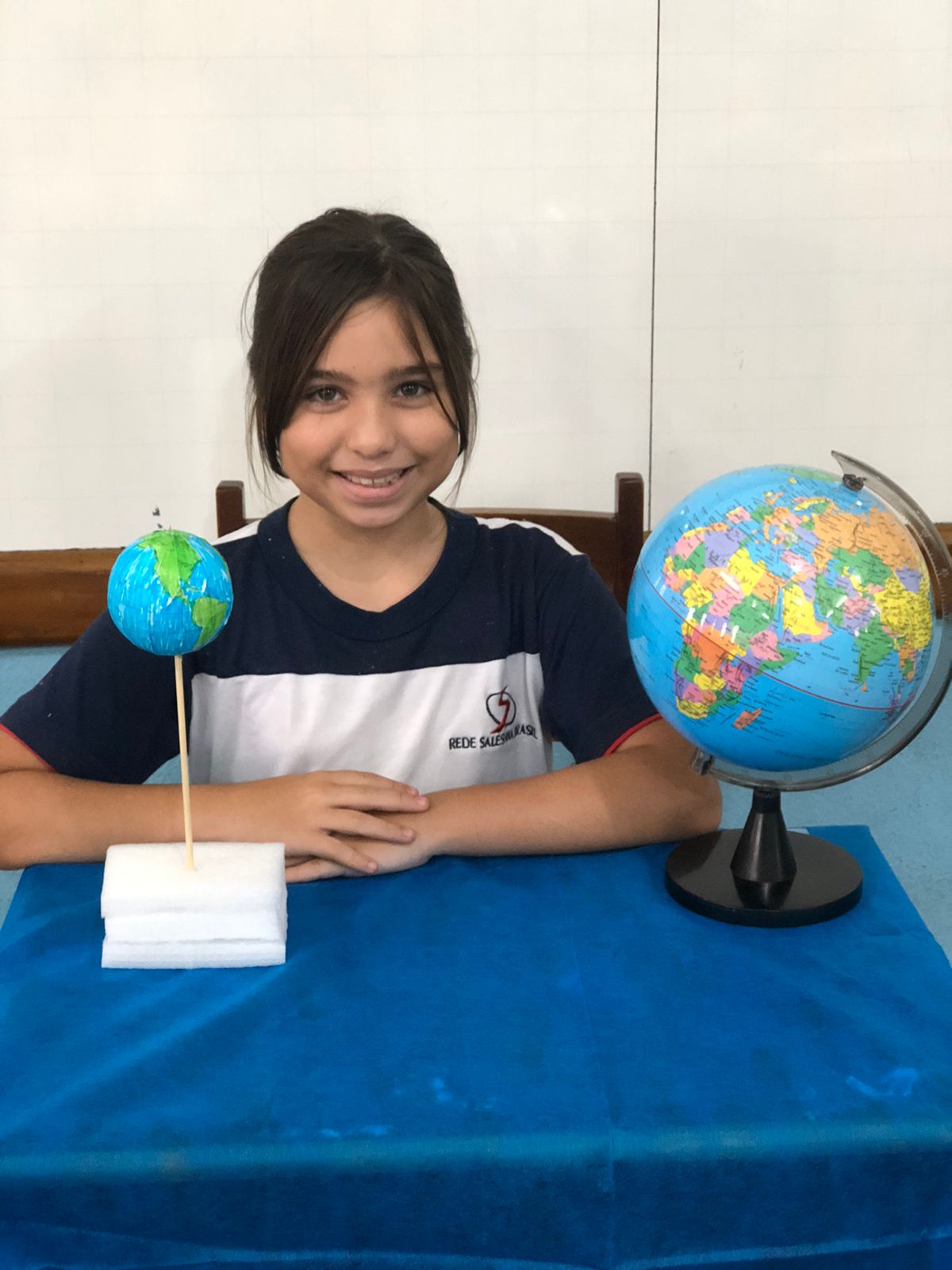 Os alunos do 3º ano confeccionaram um globo terrestre para realização da apresentação na aula de ciências. Assim, compreender como o nosso planeta tem o formato de uma esfera, como a bola de isopor, é preciso girar para visualizar os lugares e com base na observação, manipulação e comparação de diferentes formas de representação do planeta e como se assemelha à forma real.